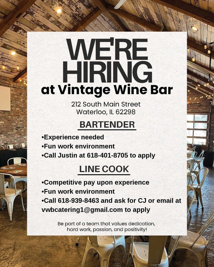 We are a local, family-owned business that made a dream into a reality. With a lot of hard work and determination, we gave new life to a historic building from 1852 in downtown Waterloo, Illinois. Stepping through our doors is like stepping back in time, and we can’t wait for you to experience all that our business has to offer! Whether you have a pallet for unique wine from around the world, domestic or craft beer, bold bourbon, or creative cocktails, we have something for everyone. Be sure to pair your favorite beverage with a delicious appetizer, panini, or pizza from our newly expanded food menu. We have a wide variety of live music every Wednesday through Sunday, which is listed on the Vintage Wine Bar Facebook page. If you’d like to join our Wine Club or book an event, all the information you need is on our website. Cheers!